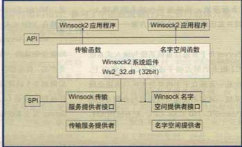 Winsock2 SPI允許開發兩類服務提供者——傳輸服務提供者和名字空間服務提供者。“傳輸提供者”(Transport Providers, 一般稱作協議堆棧,例如TCP/IP)能夠提供建立通信、傳輸數據、日常數據流控制和錯誤控制等傳輸功能方面的服務。“名字空間提供者”(Name Space Providers,例如DNS名字解析服務)則把一個的地址屬性和一個或多個用戶友好名稱關聯到一起,以便啟用與應用無關的名字解析方案。