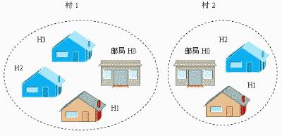 我們來(lái)打個(gè)比方:以附圖為例,小K住在村1的H1中,村里有個(gè)郵局H0,現(xiàn)在小K有兩封信分別要給住在村1的H3和村2的H1中的人。小K的地址為:村1.H1,郵局的地址為:村1.H0