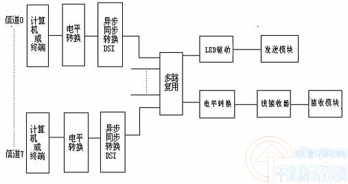 圖1光通信系統的基本組成結構圖 它適合于光纖模擬通信系統中,而且也適用于光纖數字通信系統和數據通信系統。在光纖模擬通信系統中,電信號處理是指對基帶信號進行放大、預調制等處理,而電信號反處理則是發端處理的逆過程,即解調、放大等處理。在光纖數字通信系統中,電信號處理是指對基帶信號進行放大、取樣、量化,即脈沖編碼調制(PCM)和線路碼型編碼處理等,而電信號反處理也是發端的逆過程。對數據光纖通信,電信號處理主要包括對信號進行放大,和數字通信系統不同的是它不需要碼型變換。 3光端機的作用和目前光端機的狀況 在光纖通信系統中,光發射機是光端機、光中繼器的重要組成部分,它的最基本功能是將要傳輸的電信號調制在光波上,并將其注入到光纖線路中。光接收機的主要功能是將接收的光信號變換為原電信號,并且用自動增益控制電路(AGC)保證穩定的輸出,光接收的主要部件是光檢測器,它的主要任務是進行光電轉換。從光發送端輸出經光纜線路傳輸被衰減的光信號到達接收端已是很微弱的了,為了有效地進行光電轉換,系統要求光檢測器要響應度高、噪聲低,響應速度快,工作穩定可靠。 目前的數據光端機已經有一段發展歷程了,不在是簡單的一路或四路的,也不在是單純的某一接口了,而已經達到上百路(如120路、240路等),各種不同接口(RS-232、RS-485、USB等)相當成熟的地步了,像武漢波仕電子、北京訊風通信、杭州億幫通信等公司的主要產品就是光端機,其中波仕電子的RS-232單模和多模的光端機還可以做到無須電源。本文僅就八路來說明其復用原理。 4數據光端機設計所要達到的目的和功能及意義 本設計為多路RS-232C接口標準是一種廣泛使用的普及標準。它涉及使用的普及標準。它涉及的范圍很廣,遠遠超出了通信和計算機的領域。60年代中期,幾乎毫無例外的使用電話交換網實現遠程訪問,于是RS-232C接口進行本地通信,因此使用更加廣泛。本設計正是基于RS-232串行口通過光纖傳輸。 隨著分布計算機的建立,所需通信設備費用逐漸成為用戶所關心的主要問題,為了減少這些費用,通過研究大量網絡結構,從而確定盡可能采用專用設備。很多網絡是地理分布的用戶訪問公用計算設備,將中心的地區建設成為鏈接這些用戶到計算機的服務中心。盡管當終端業務量較少,使用專用租用線費用不太合理,但若能采用很多終端共用通信設備的結構,一般就能減少對一組用戶提供通信的積累費用,而多路復用器的利用就可能用一條高速線路承擔原來有一組低俗線路分別傳輸的業務量,所以當同一地理區域的大量數據終端進行通信時,或者但任意距離的很多租用線并行傳輸時應考慮使用多路復用器。 本數據光端機采用多路的設計,不但可以大大利用了線路,充分利用光纖巨大的帶寬資源。并且可以更廣泛的應用于各個領域,本設計的八路復用技術,可用八路信道傳輸不同的信息,將不同信息復用到一條光中進行傳輸,節省了設備,在現場的應用中可在同一系統中,將多種控制信息和數據信息用一臺光端機進行傳輸,可同時連接計算機及其他符合RS-232標準的終端,方便控制和操作。這就是多路復用光端機的設計意義之所在,本文僅以八路復用來起到拋磚引玉的作用。 5數據光端機的設計整體說明 整體電路的原理框圖如圖2所示:它將若干終端多路接入一個高速數據鏈路中,發送過程由計算機或終端傳送來的RS-232C標準信號先要進行電平轉換,將RS-232C電平轉換為TTL電平,以便和后續電路兼容,再經過MOTOROLA的MC145428異步同步轉換芯片將RS-232C幀結構中的起始位,停止位去除后,轉換為同步輸出。再經過一個多路復用電路將多路信號復用唯一路徑LED驅動后再對光源進行調制,將電信號轉換為光信號發送到光纖中傳輸。