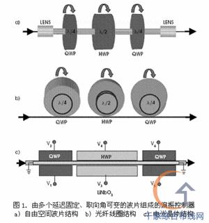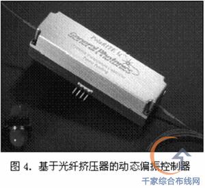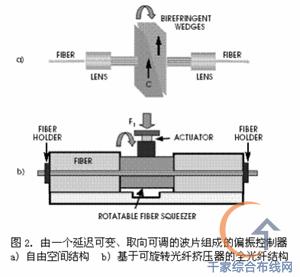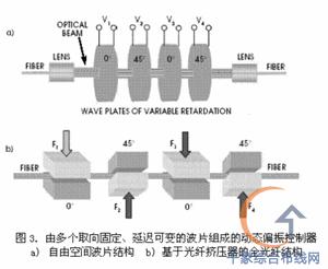 這種裝置不僅插入損耗低、成本低,而且與“米老鼠耳朵”形狀的偏振控制器相比,它還具有體積小、對波長不敏感的優點。這些優點使得此種偏振控制器有益于集成到 WDM 模塊中使用。但是,與依靠機械旋轉的偏振控制器相同,這種器件的調節速度非常慢,以至于無法應用于光纖網絡的 PMD 補償。 偏振控制器還可以使用幾個取向成 45 o角的自由空間波片來實現(如圖 3a 所示)。每個波片的延遲隨加載的電壓變化;波片的取向固定。這種可變延遲波片可由液晶、電光晶體或電光陶瓷等材料制成。采用液晶材料的缺點是調節速度慢,而電光晶體一般需要極高的工作電壓。這種類型的偏振控制器一般具有插入損耗高、成本高、以及由增透膜和微透鏡造成的工作帶寬窄等缺點。 全光纖解決方案 一種與圖 3a 所示裝置具有相同工作原理的全光纖偏振控制器(如圖 3b 所示)可以解決插入損耗高和成本高的問題。波片的延遲隨光纖擠壓器施加的壓力而變化。這種裝置的關鍵在于如何提高器件的可靠性、緊湊性和性價比。 在已商用化的 PolaRITE II 動態偏振控制器中,壓電促動器驅動擠壓器快速變化。由于是全光纖結構,該器件不僅沒有背向反射,而且插入損耗和偏振相關損耗都極低。它的響應速度為 30 μ s ,足夠跟蹤野外鋪設的光纖鏈路中速度最快的偏振態波動。采用適當的控制程序,無需中斷即可實現無限制(無需重置)的偏振控制。