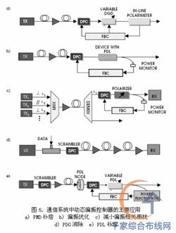 這種偏振控制器的啟動損耗小于0.003dB,使其在高精度 PDL 測試儀器及偏振相關損害補償的反饋回路中同樣適用。而且它對波長也不敏感,對波長范圍在 1280nm ~ 1650nm 內的信號具有一致的良好工作性能。 系統應用 基于光纖擠壓器的動態偏振控制器( DPC )具有插入損耗低、偏振相關損耗低、啟動損耗低、背向反射小、高速度與低成本等優點。如圖 5a -e 所示,在光通信系統的應用中,它是克服偏振相關損害的理想選擇。 DPC 在以下幾種應用中都發揮著重要的作用: ◆ PMD 補償:如圖 5a 所示,一個典型的一階 PMD 補償器由一個動態偏振控制器和一個固定的或可變的差分群遲延線( DGD )組成 3 。使用在線偏振測試計測量 DOP 參數,可以監測鏈路的 PMD 2 。隨后 DOP 信號被反饋回來以控制 DPC 和 DGD 。典型的 PMD 檢測和 DPC 響應時間為 100μs 。 ◆ 偏振優化:傳輸鏈路中的許多器件或模塊都是偏振敏感的,如光電(E-O)和電吸收(EA)調制器、光干涉計、外差光接收器等。在這樣的鏈路中使用一個 DPC (如圖 5b),即可通過優化器件或模塊的輸出功率,實現偏振敏感度的最小化。這種方案同樣也可以用來降低許多無源器件的 PDL 效應。 ◆ 減小偏振相關串擾:為了提高 DWDM 系統的頻譜效率,人們使用了兩種偏振相關的傳輸技術:偏振復用( PDM )技術,即同一波長的兩個正交偏振態的復用;偏振交錯技術,即兩個偏振態正交的相鄰 WDM 信道的復用。圖 5c 所示的是偏振交錯技術, DPC (后面緊跟著一個起偏器)被用來減小兩個相鄰信道的偏振相關串擾。 ◆ 偏振擾動:基于光纖擠壓器的動態偏振控制器也可以用做擾偏器,以得到高度隨機的偏振態。擾偏器帶有內置的諧振增強電路,在擾偏頻率下的半波電壓只有幾伏。選擇合適的驅動參數,已經成功地獲得了小于 0.05dB 的偏振敏感度和小于 1% 的偏振度。擾偏器的主要應用包括: ◆ 降低偏振相關增益:在傳輸系統中(如圖 5d ),由偏振相關增益( PDG )引起光放大器的性能降低可以通過擾偏來抑止。偏振相關增益與偏振度成正比,低的偏振度可以降低偏振燒孔效應( PHB ),減小偏振相關增益 5。當 SOP 的擾動頻率大于光放大器響應時間( ms 級)的倒數時,偏振度就能夠達到最小。 ◆ 消除偏振敏感性:擾偏器可以用來消除儀器的偏振敏感性。一些光學儀器,如基于衍射光柵原理的光譜儀,對輸入光的偏振態敏感。擾動輸入光的偏振態可以消除由偏振敏感引起的測量不確定性。 ◆ 簡化 PMD 補償:擾偏器可以用來簡化通信系統中的 PMD 補償 6 。低的殘余相位調制度對簡化 PMD 補償是非常關鍵的。基于光纖擠壓器的擾偏器以其極低的殘余相位調制度,特別適合此種應用。 ◆ PDL 監測與補償:在光器件的制造過程中,快速而準確的監控 PDL 是非常重要的。基于光纖擠壓器的動態偏振控制器由于低 PDL 、低啟動損耗以及對 PDL 測試準確度的極大提高,在這些應用中極富吸引力。在系統應用中,為了監測和補償沿鏈路的 PDL ,需要把快速擾偏器放置在光發射模塊之后,通過監測由器件或光模塊(如 EDFA 等)的 PDL 引起的功率起伏,來監控系統的 PDL 。通過反饋信號來控制動態偏振控制器和產生 PDL 的器件,可以使功率起伏達到最小(如圖 5e 所示)。 總而言之,基于光纖擠壓器的動態偏振控制器是克服光傳輸系統中偏振相關損害和監測儀器偏振特性的關鍵元件。 網絡的神奇作用吸引著越來越多的用戶加入其中,正因如此,網絡的承受能力也面臨著越來越嚴峻的考驗―從硬件上、軟件上、所用標準上......,各項技術都需要適時應勢,對應發展,這正是網絡迅速走向進步的催化劑。 |