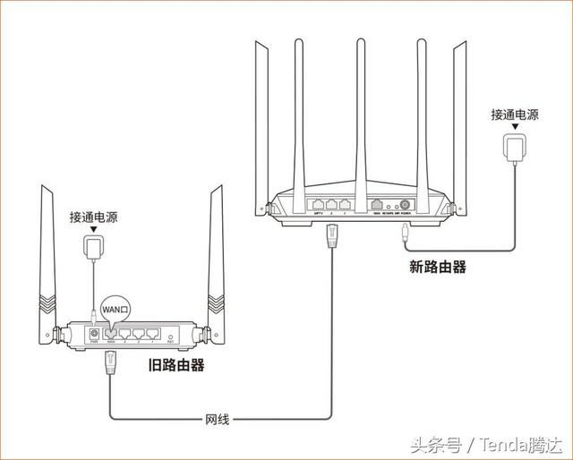 下面以騰達AC7舉例說明:連接舊路由器和騰達AC7電源用短網線連接AC7的任意一個LAN口和舊路由器WAN 口。當AC7的LAN當口指示燈快閃變為常亮(持續3秒以上),代表寬帶賬號和密碼遷移成功。