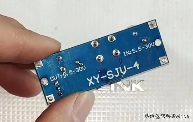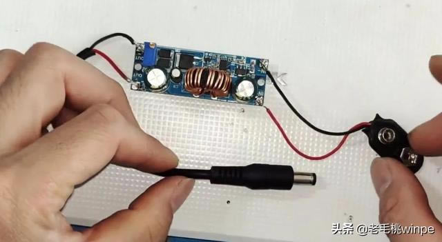 要知道路由器的工作電壓是直流9伏,所以用這么小的升壓模塊很容易達到預期的效果。 具體操作步驟: 1.在升壓模塊板的輸出側上焊接路由器的供電頭,注意區分正負極。