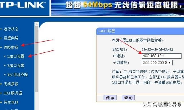 2.進入路由器管理頁面,找到頁面左側的網絡參數---LAN改變口設置IP地址”的LAN設置為“192.168.10.設置完成后點保存并重啟路由器。