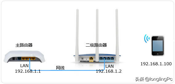 指主路由器LAN從網線連接到二級路由器的端口LAN口,如下圖所示。二級路由器用作交換機,局域網的所有終端都用主路由器作為網關。