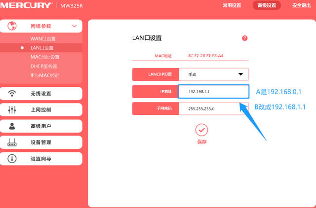 許多朋友在橋接路由器時,往往只從光貓橋接第一個路由器,但在橋接第二個路由器時,卻不知道如何設置。本文以水星路由器為例,教你如何在第一個路由器的基礎上橋接第二個路由器。 假設第一置第二個路由器之前,我們必須先做一些準備,假設第一個路由器是A第二個路由器是B所以我們必須首先弄清楚兩個路由器的默認網關是什么。通常默認情況下是192.168.0.1或192.168.1.1. ![]() B 1.修改路由器B的默認網關正如前面提到的,首先找出兩個路由器的默認網關。如果品牌相同的路由器或默認網關相同,則在設置路由器之前不要與A路由器連接,直接用網線插入電腦的有線網絡接口。 然后我們輸入路由器的默認網關進入路由器的管理界面,找到默認網關選項,并將其修改為與a路由器不沖突的網關。 然后我們輸入路由器的默認網關進入路由器的管理界面,找到默認網關選項,并將其修改為與a路由器不沖突的網關。假設路由器A的默認網關是192年.168.0.1.那么B路由器的默認網關就會變成其他網關。如下圖:二、選擇互聯網模式 以家庭寬帶為例,連接光貓的第一個路由器A上網模式應該是寬帶撥號模式,連接網絡運營商提供的寬帶賬號和密碼。而第二路由器B不能這樣設置。如果第一個路由器A打開DHCP功能,所以第二個路由器B的上網模式只能手動或自動獲取IP正常情況下,使用自動獲取的形式IP模式聯網模式。如下圖:三、設置WiFi網絡 當我們修改第二個路由器B的默認網關(防止與第一個路由器的默認網關發生沖突)時,確定第一個路由器A打開DHCP功能完成后,將第二個路由器B設置為自動獲取IP點擊保存退出模式。 然后找到第二臺路由器BWiFi設置選項,設置WiFi點擊保存退出密碼。如下圖:當我們進行到這一步時,第二臺路由器B的上網模式和WiFi網絡設置完畢,用網線將兩個路由器連接在一起,即可正常使用。注意連接WAN和LAN口,不要插錯,插錯不能正常使用。