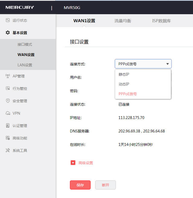 登錄后點【基本設置】【接口模式】,每個端口的功能都可以設置。如果您選擇一條寬帶單條WAN口】,選擇相應的多條寬帶WAN口數,并記錄哪只寬帶貓接哪個口,以便以后調試相應的寬帶上網方式。