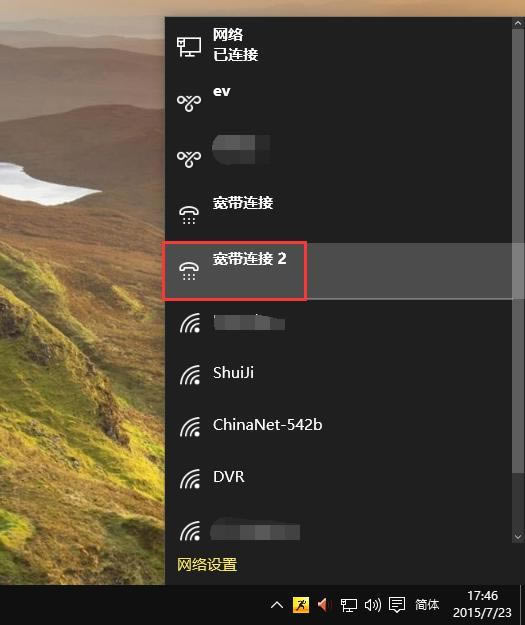 5.這次創(chuàng)建成功后,如果下次想用寬帶連接,可以在任務(wù)欄點(diǎn)擊網(wǎng)絡(luò)圖標(biāo),然后點(diǎn)擊【寬帶連接】拔號。