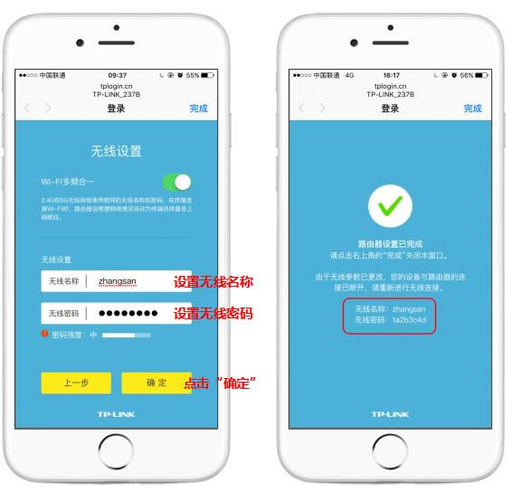 5.設置路由器的無線名稱和密碼,點擊完成保存配置。請務必記住路由器的無線名稱和密碼,并在后續連接路由器無線時使用。