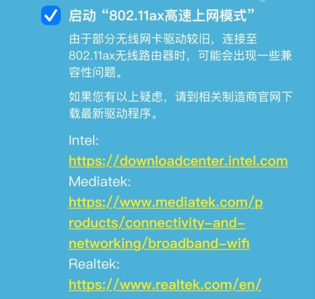 無線設置也叫wifi如果,如果您的路由器wifi6路由器會提示你是否打開802.11ax高速互聯網模式。