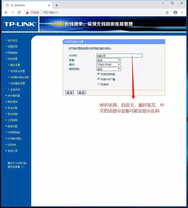 接著點擊 無線設置-基本設置 自行設置SSID號(即WiFi這里建議用英語,如果使用中文,一些設備將顯示亂碼