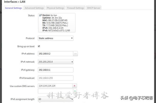 配置LAN口為靜態(tài)IP地址,因?yàn)槲壹业穆酚善鱅P地址是192.168.0.1,掩碼為255.255.255.255.0,故我的WAN 口配置成IP為192.168.0.2, 掩碼同樣為255.255.255.255.0,網(wǎng)關(guān)地址為192.168.0.1,DNS地址填了“114.114.114.114”和“223.5.5.5”。如下圖所示。如下圖所示。