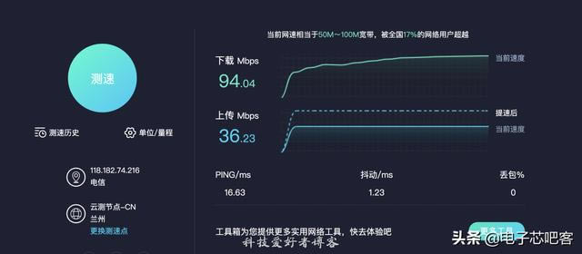 用戶端測(cè)試,下載速度幾乎穩(wěn)定在99Mbps,上傳速度穩(wěn)定在36Mbps左右。