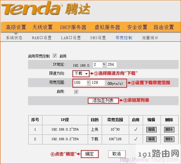 | 路由器(Router)是連接兩個或多個網絡的硬件設備,在網絡間起網關的作用,是讀取每一個數據包中的地址然后決定如何傳送的專用智能性的網絡設備。 原標題:"騰達(Tenda)無線路由器限速設置方法"的相關路由192.168.1.1登錄設置教程。來源 - 本站。 本文解決問題:在騰達(Tenda)無線路由器限制局域網中計算機網速的方法,局域網中某一臺計算機在線觀看視頻、使用迅雷等p2p軟件下載文件時,會大量占用寬帶,其他計算機可能無法正常瀏覽網頁了,因此合理的分配每一臺計算機允許使用的最大帶寬是非常有必要的。 寬帶單位換算對照表![]() 登錄設置界面1.在瀏覽器中輸入:192.168.0.1 按回車鍵,在跳轉的頁面中輸入密碼admin ,確定即可。(如果192.168.0.1打不開,請閱讀文章:騰達(Tenda)無線路由器192.168.0.1打不開的解決辦法) ![]() 2.點擊“高級設置”。 ![]() 設置限速1.點擊“帶寬控制”---->設置“上傳”帶寬范圍(以2M adsl撥號,2個人平均分配網速為例) ![]() 2.設置“下載”帶寬范圍---“確定”。 ![]() 重啟路由器點擊“系統工具”-“重啟路由器”將路由器重啟,重啟完成后,設置的限速策略就生效了。 ![]() 注意:如果想單獨控制一臺電腦的網速,只需要查看到對方的ip地址,并在騰達路由器上進行IP和MAC地址綁定,確保對方一直使用這個Ip地址;然后在“第二步”把ip地址換成這個綁定IP地址,帶寬設置范圍可以參照我們的帶寬對照表設置。 路由器不僅讓你更穩定快速地連接無線網絡,更可以讓家中的智能設備連接在一起。 |