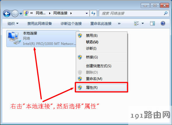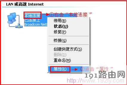 2、鼠標(biāo)右擊“本地連接”—>點擊“屬性”