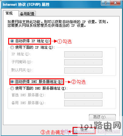 5、勾選“自動獲得IP地址”和“自動獲得DNS服務(wù)器地址”選項---->點擊“確定”。