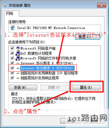 4、——>選擇“Internet協(xié)議版本4(TCP/IPv4)”,并點擊“屬性”。