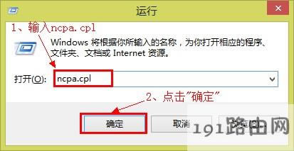 2、在運行程序里面輸入ncpa.cpl—>點擊”確定”(或者按鍵盤上面的回車鍵)