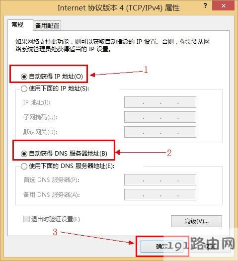 4、選擇“自動獲得IP地址”和“自動獲得DNS服務(wù)器地址”——>點擊“確定”。