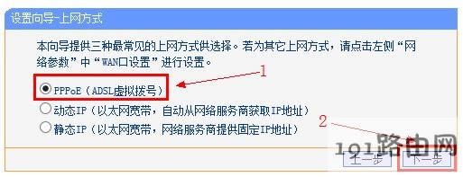 3、選擇“PPPoE(ADSL虛擬撥號)”,然后點擊“下一步”。