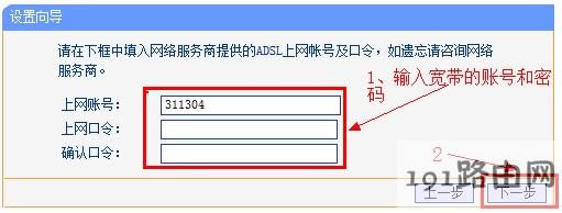 4、輸入“上網(wǎng)賬號”和“上網(wǎng)口令”(寬帶運營商提供給你的上網(wǎng)帳號和密碼),然后點擊“下一步”。
