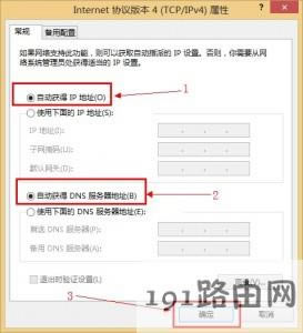 5、自動配置Windows 8的ip地址:勾選”自動獲得ip地址”和“自動獲得DNS服務(wù)器地址”選項點擊”確定”