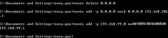 4. 從上面的路由表可以看出,系統中有兩條路由缺失,這也是不能同時訪問兩個網絡的主要原因。為了解決這個問題,我們需要修改路由表。 首先使用route delete 0.0.0.0此命令刪除缺省路由; 然后手動設置兩條路由,如下圖所示:
