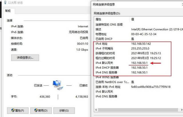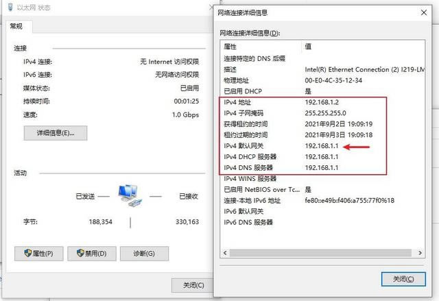 7、等RAX50開機后,我們這臺PC臺式機會連接到一個新的網絡,你可以看到網關變成了192.168.1.1: