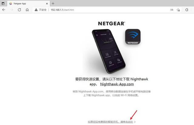 我們在瀏覽器,輸入 192.168.1.1 ,您可以登錄網件的后臺頁面! 因為我不習慣使用手機來初始化路由器,所以我仍然使用傳統的計算機初始化,事實上,網絡也提供了一個非常方便的連接方式,插入電源后,手機直接搜索wifi可初始化。 無需智能手機初始化,我們點擊底部: