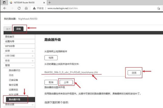 事實上,幾年前,從用網件開始R7000年初,我用梅林固件,官方固件,我只在Orbi體驗更多,雖然穩定,但功能真的不多,遠不如梅林固件。 登錄網件后臺系統后,點擊高級路由器升級。 選擇右邊剛下載的梅林固件,直接點擊上傳: