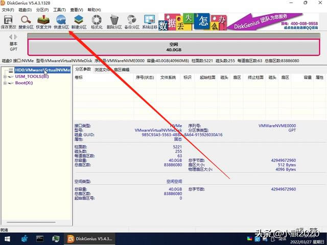 假如你是新硬盤,無分區,直接點擊上面菜單中的快速分區