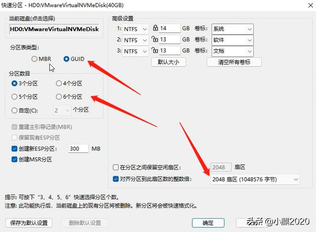 分區界面 win10以上的系統選擇GUID分區表,win7以下系統選擇MBR分區表 然后根據硬盤的大小選擇分區的數量,最后將2048扇區改為4096扇區(4K對齊),點擊確定開始分區
