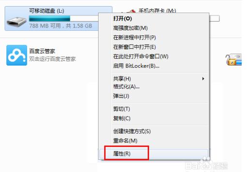 2、當(dāng)電腦能夠正常識別U盤時,我們可以對U盤進(jìn)行一次嘗試修復(fù)操作。右擊U盤盤符,從彈出的菜單中選擇“屬性”。