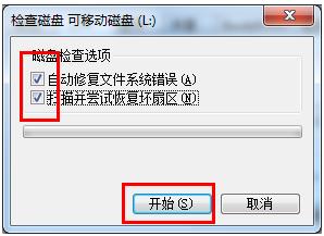 4、在彈出的窗口中,勾選 兩項,并點擊“開始”按鈕來嘗試修復(fù)U盤寫保護(hù)錯誤。