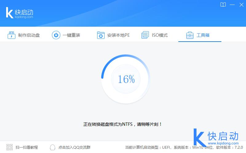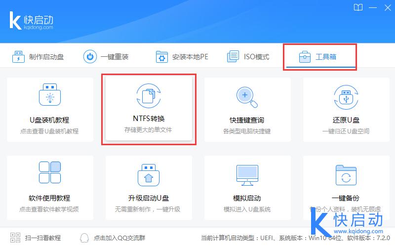 U盤,全稱USB閃存盤,英文名“USB flash disk”。 它是一種使用USB接口的無需物理驅(qū)動器的微型高容量移動存儲產(chǎn)品,通過USB接口與電腦連接,實現(xiàn)即插即用。U盤連接到電腦的USB接口后,U盤的資料可與電腦交換。而之后生產(chǎn)的類似技術(shù)的設備由于朗科已進行專利注冊,而不能再稱之為“優(yōu)盤”,而改稱“U盤”。后來,U盤這個稱呼因其簡單易記而因而廣為人知,是移動存儲設備之一,F(xiàn)在市面上出現(xiàn)了許多支持多種端口的U盤,即三通U盤(USB電腦端口、iOS蘋果接口、安卓接口)。 雖說u盤有FAT32和NTFS這兩種格式之分,但是大家都想將U盤轉(zhuǎn)換成NTFS格式,以便于存儲大于4G以上的文件。那么,U盤如何轉(zhuǎn)換成NTFS格式?其實我們只需要使用軟件,就能一步到位解決問題,今天我們一起來瞧瞧吧。 1、將U盤插入電腦,下載U盤啟動盤制作工具并雙擊打開,在軟件界面上找到工具箱,點擊工具箱中的“NTFS轉(zhuǎn)換”圖標,如下圖所示: