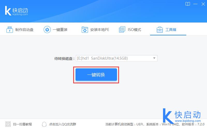 ![]() 2、選擇需要進行格式轉(zhuǎn)換的磁盤,然后點擊“一鍵轉(zhuǎn)換”,隨后U盤啟動盤制作工具便開始進行格式轉(zhuǎn)換,如下圖所示: