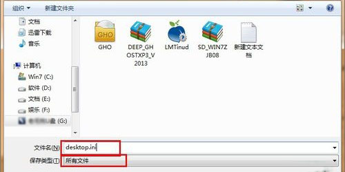 4、接著我們把里面的文件名改為desktop.ini,擴(kuò)展名記得要是“ini”的文件,然后保存下。按下F5刷新即可;如果擔(dān)心在使用的時(shí)候不小心把這個(gè)文件和圖片刪除掉的話那么我們可以右擊屬性選擇隱藏。