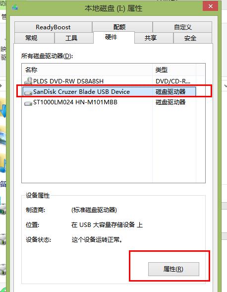 2、進入U盤的屬性界面后,選擇“硬件”,然后點擊選擇USB類型的磁盤驅動器,點擊選擇“屬性”。
