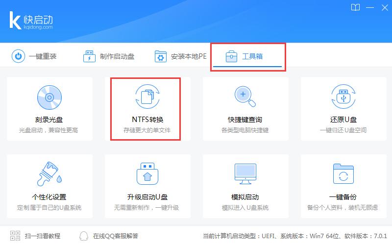 除了上面介紹的這個方法之外,還有另外兩個方法大家可以嘗試一下。 第一種:利用快啟動工具箱中的“NTFS轉換”工具進行轉換 大家可以下載一個快啟動u盤啟動盤制作工具,利用工具箱中的“NTFS轉換”工具進行快速轉換。具體操作方法可參考:<快啟動U盤啟動盤制作工具中的NTFS轉換有什么用?>。