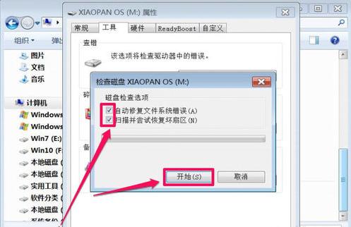 ![]() 4、在檢查磁盤選項窗口,將“自動修復文件系統錯誤”和“掃描并嘗試恢復壞扇區”這兩項都勾選上,再按“開始”。經過檢查后,大多數U盤亂碼情況,都會修復的。