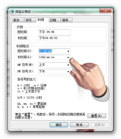 【改用12小時制】 Windows7系統中,系統時鐘默認采用24小時制,如果不習慣,可以改成12小時制。單擊“日期和時間設置”窗口左下角“更改日歷設置”,彈出“自定義格式”窗口,切換到“時間”選項卡,將“時間格式”欄中表示24小時制的“H”改為表示12小時制的“h”,并且在前面加上表示上午和下午的“tt”,例如:短時間改為“tt:h:mm”(不含雙引號),長時間改為“tt:h:mm:ss”(不含雙引號),最后單擊“確定”按鈕,保存設置,這樣就可以把系統默認的24小時制改為12小時制