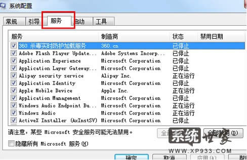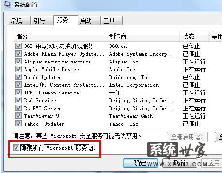 切換到服務選項,然后將下方的隱藏所有microsoft選項勾選上,F在上面的窗口中出現的服務就是真實的電腦中第三方加載項的全部服務項目了,大家可以看看,哪些是不需要的,就將它刪除好了。