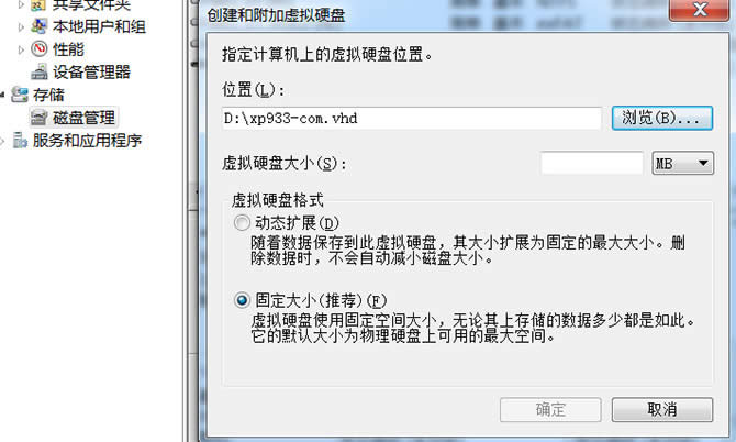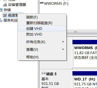 3.在“磁盤管理”項單擊右鍵,選擇“創建VHD”,按提示進行操作。