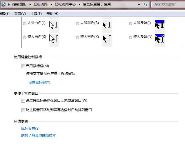 2、在“輕松訪問中心”下選擇“更改鼠標的工作方式”,在打開的“使鼠標更易于使用”窗口里,勾選上“通過鼠標懸停在窗口上來激活窗口”,應用確定后,退出就搞定了。