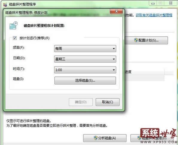 此外,不想每次都手工運行磁盤碎片清理的話,也可以通過“配置計劃”進行設置,讓“磁盤碎片清理”在每周固定的時間自動進行,以保證Win7的減負加速。