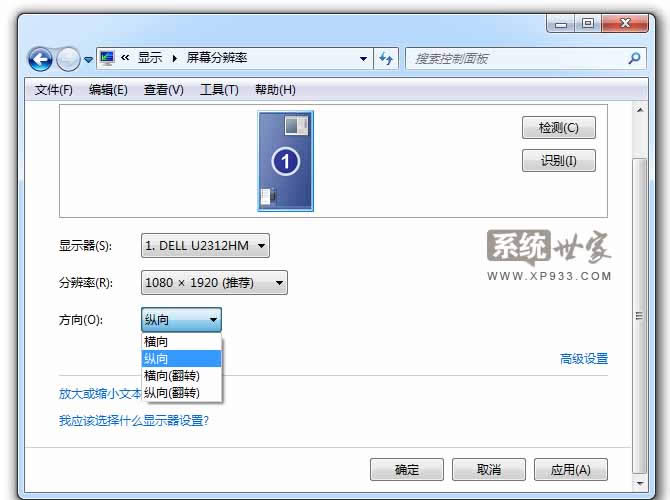 win7系統如何切換顯示屏幕方向? 2、在打開的屏幕分辨率窗口中,可以看到下方的方向處,點擊“方向后面的下拉按鈕就可以選擇你想要切換的方向了,比如“橫向”,可以根據自己習慣進行設置,最后點擊應用按鈕之后再點擊確定按鈕就可以進行切換了哦。