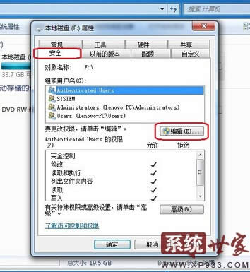 接下來(lái),我們將屬性窗口切換到安全欄目下,然后點(diǎn)擊編輯選項(xiàng)。接下來(lái)點(diǎn)擊添加。