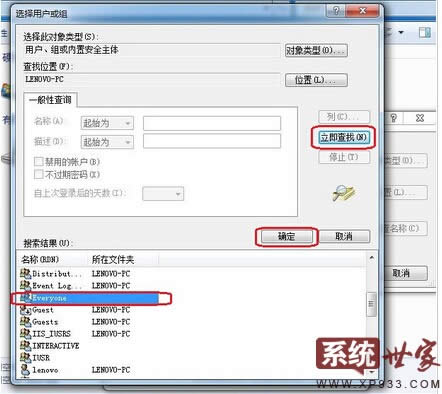 在新彈出來(lái)的選擇用戶組界面中,我們點(diǎn)擊最底部的高級(jí)選項(xiàng),然后找到右邊的立即查找,這個(gè)時(shí)候底部會(huì)出現(xiàn)查找的選項(xiàng),我們找到win7 everyone權(quán)限就好,選中并點(diǎn)擊確定。