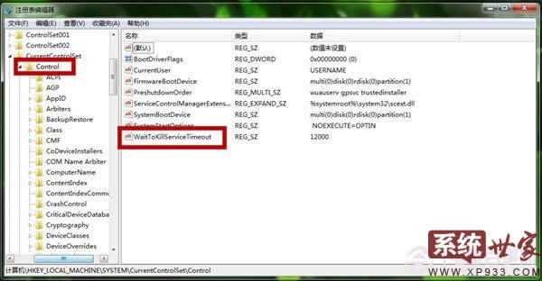 2、在打開的“注冊表編輯器”的窗口中,我們依次找到“HKEY_LOCAL_MACHINE\SYSTEM\CurrentControlSet\Control”。點擊“Control”文件夾找到右側的“waitToKillServiceTimeout”。