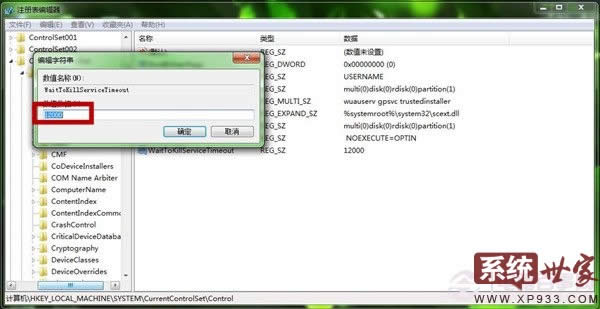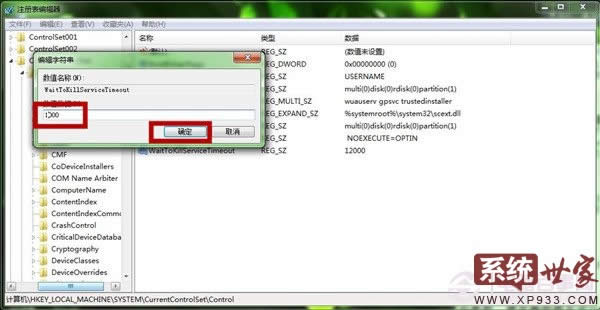 4、 在“編輯字符串”窗口中,我們將數值數據中的12000改為1000,即1秒,然后點擊“確定”,關機重啟即可。